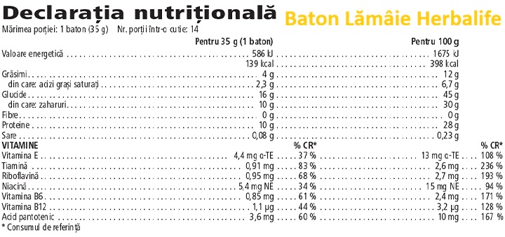 Batonul Herbalife cu lamâie contine un amestec de proteine din lapte: cazeinat de calciu, proteine din zer, cazeinat de sodiu si alte proteine din lapte. Acestea ofera un profil bun de aminoacizi, util pentru întretinerea tesutului muscular. Zerul este o proteina cu absorbtie mai rapida, iar cazeina are o eliberare mai lenta, ceea ce poate sustine satietatea între mese. În plus, batonul Herbalife include pudra de albumina din ou, o sursa valoroasa de proteine.