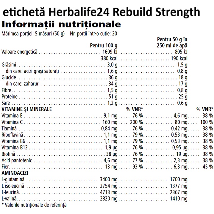Herbalife24 Rebuild Strength este un shake proteic sub forma de pudra, destinat consumului dupa efort fizic, ca parte a rutinei de nutritie sportiva. Formula combina proteine din zer, carbohidrati, aminoacizi si micronutrienti, într-un format practic la plic, usor de transportat la sala si de utilizat imediat dupa antrenament.
