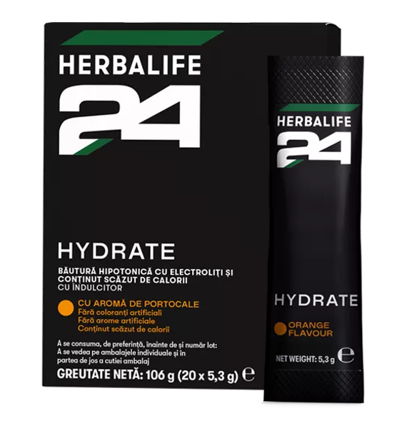 Herbalife24 Hydrate — bautura hipotonica cu electroliti, Calciu 215mg (27% VNR), Magneziu 94mg (25% VNR), Vitamina C 80mg (100% VNR), vitamine B1, B2, B5, B12. Doar 12 kcal, 1g glucide, fara zahar. Certificat Informed Sport. Aroma portocale. 20 pliculete (106g). Cod produs: 1433.