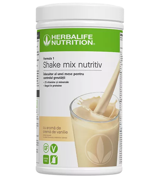 Formula 1 Herbalife Shake Mix Nutritiv cu aromă de Cremă de Vanilie — înlocuitor de masă potrivit pentru vegani, fără gluten, cu 18g proteine din izolat de soia, 25 vitamine și minerale, 5g fibre per porție. Doar ~227 kcal cu lapte semi-degresat. 550g, ~21 porții. Cod produs: 4466.