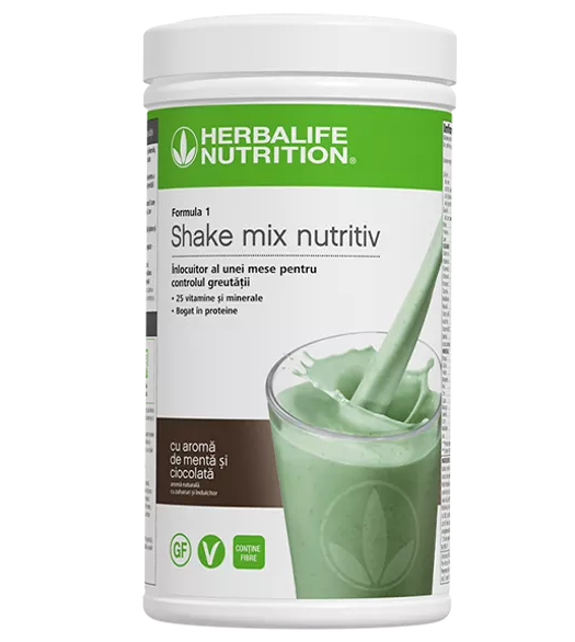 Formula 1 Herbalife Shake Mix Nutritiv cu aromă de Mentă și Ciocolată — înlocuitor de masă potrivit pentru vegani, fără gluten, cu 18g proteine din izolat de soia, 25 vitamine și minerale, 4g fibre per porție. Doar ~221 kcal cu lapte semi-degresat. 550g, ~21 porții. Cod produs: 0146.